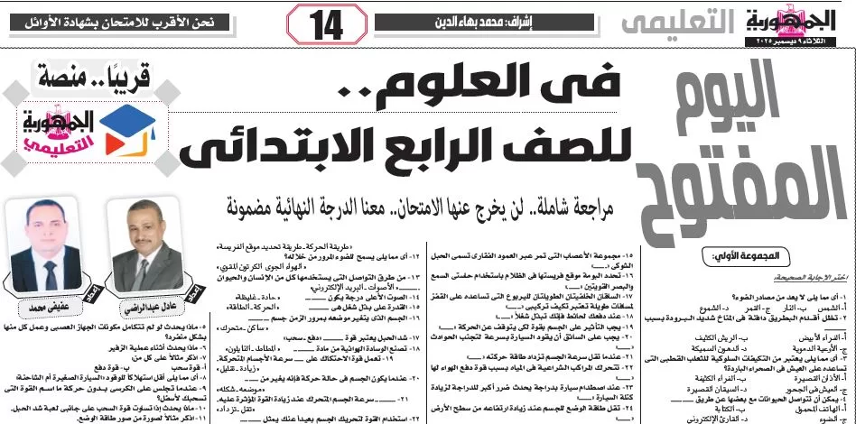ملحق الجمهورية التعليمي, العلوم – للصف الرابع الابتدائى – 9 ديسمبر 2025